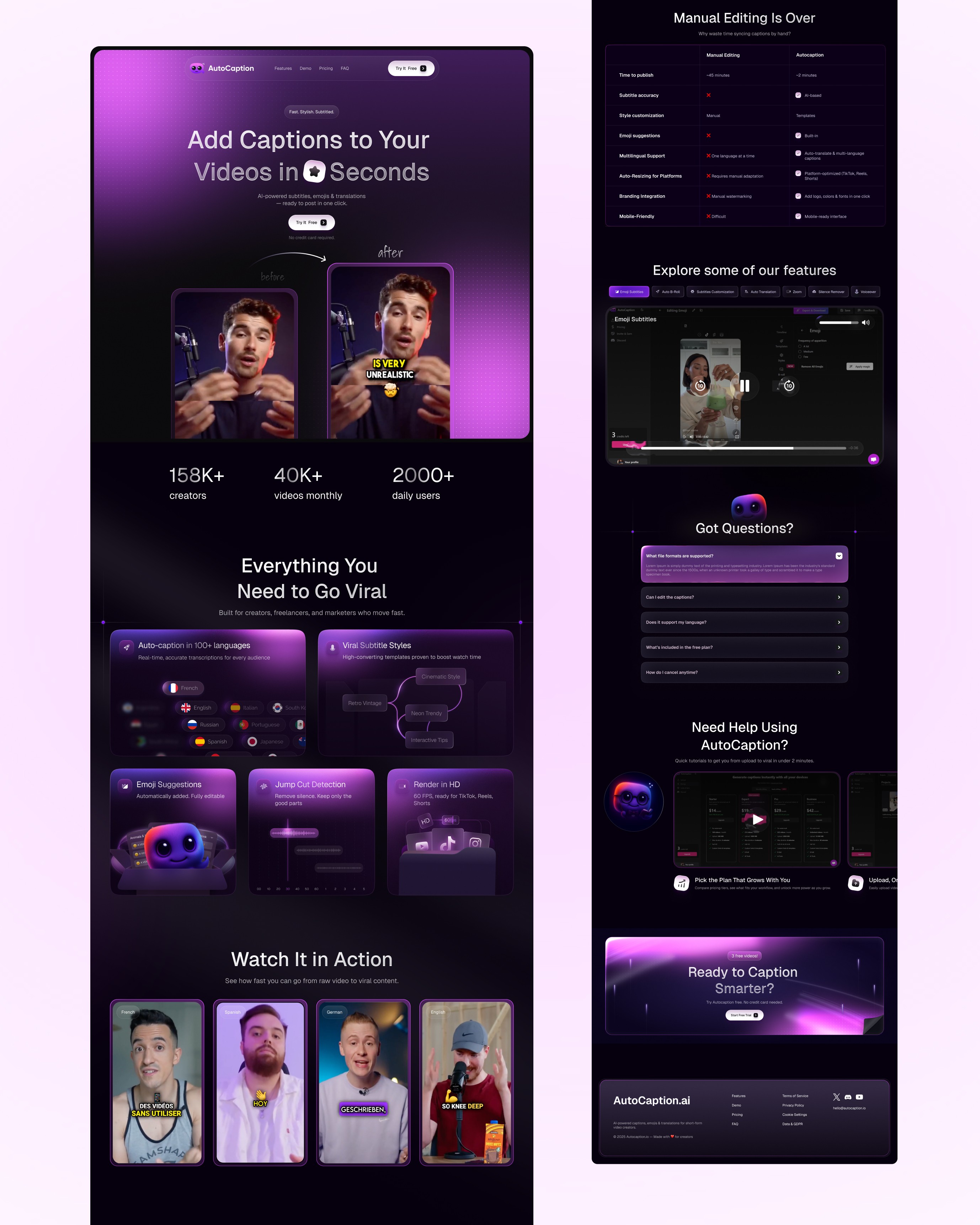 Task: Build a landing page for an AI-powered video captioning platform used by thousands of creators daily. The goal was to showcase the product’s innovative features, create a smooth user journey, and drive conversions.