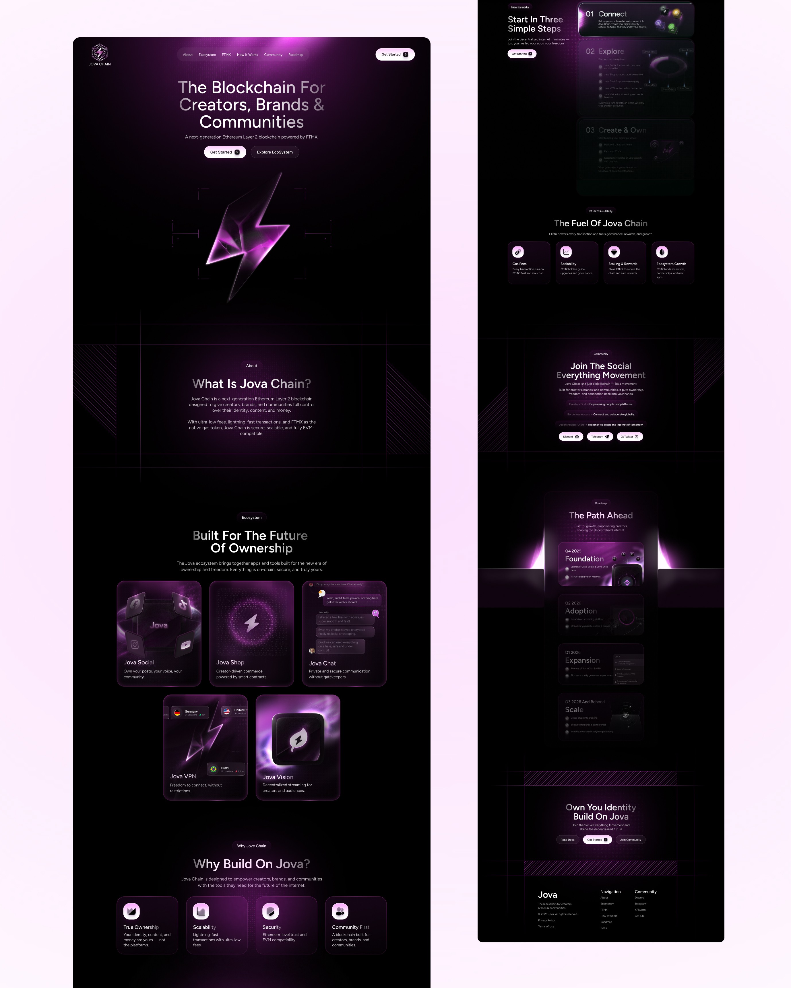 Task: Create a bold, web3-native landing page for JovaChain — an L2 blockchain designed for real-world brand adoption. The goal was to highlight its ecosystem, utilities, and roadmap while building trust through high-end visuals, animation, and structure.