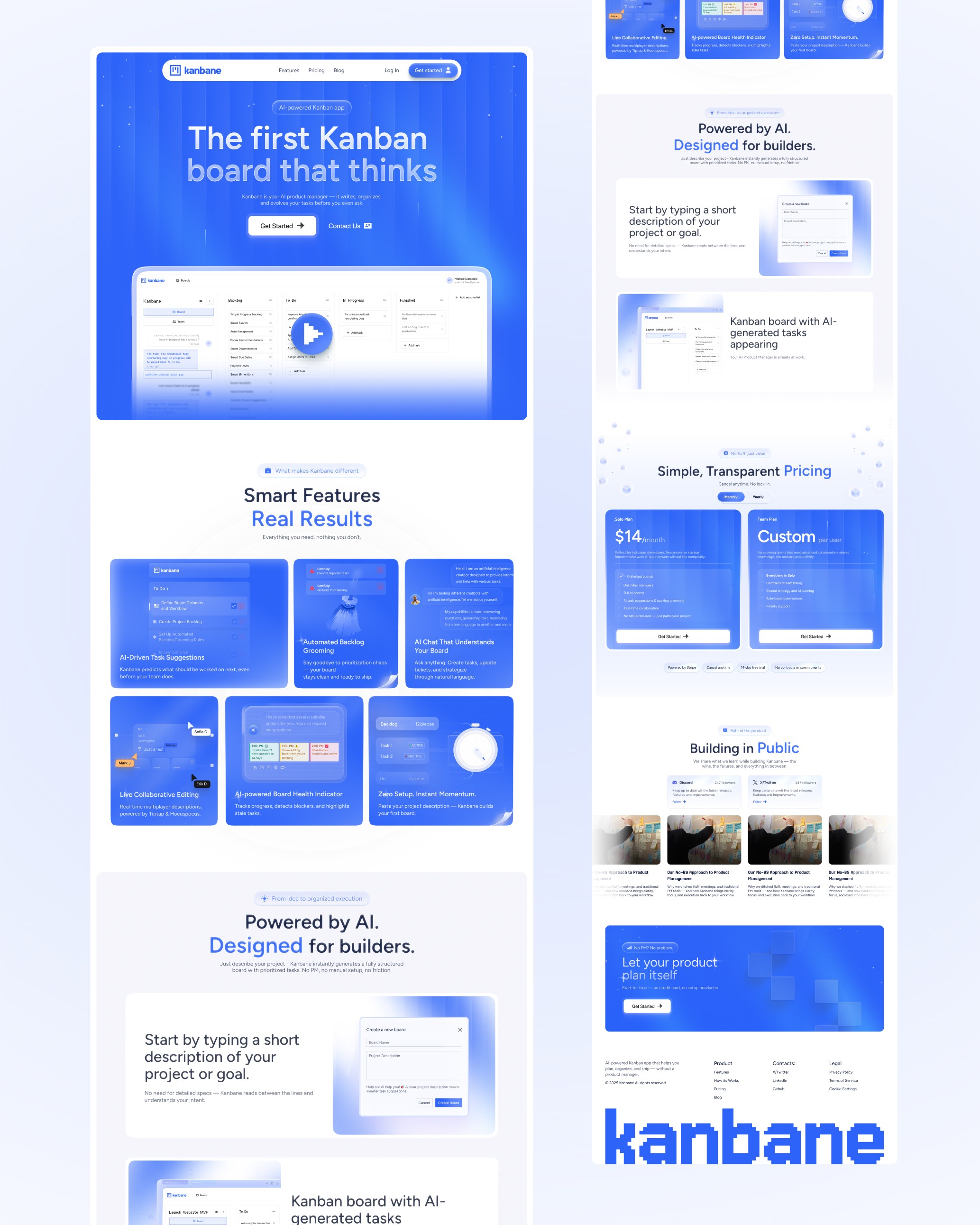 Task: Design a modern and intuitive landing page for Kanbane, a project management platform focused on simplifying workflows, task tracking, and team collaboration. The objective was to create a clean and functional UI that highlights key features and ensures a smooth user journey, while the development would be handled by the client.